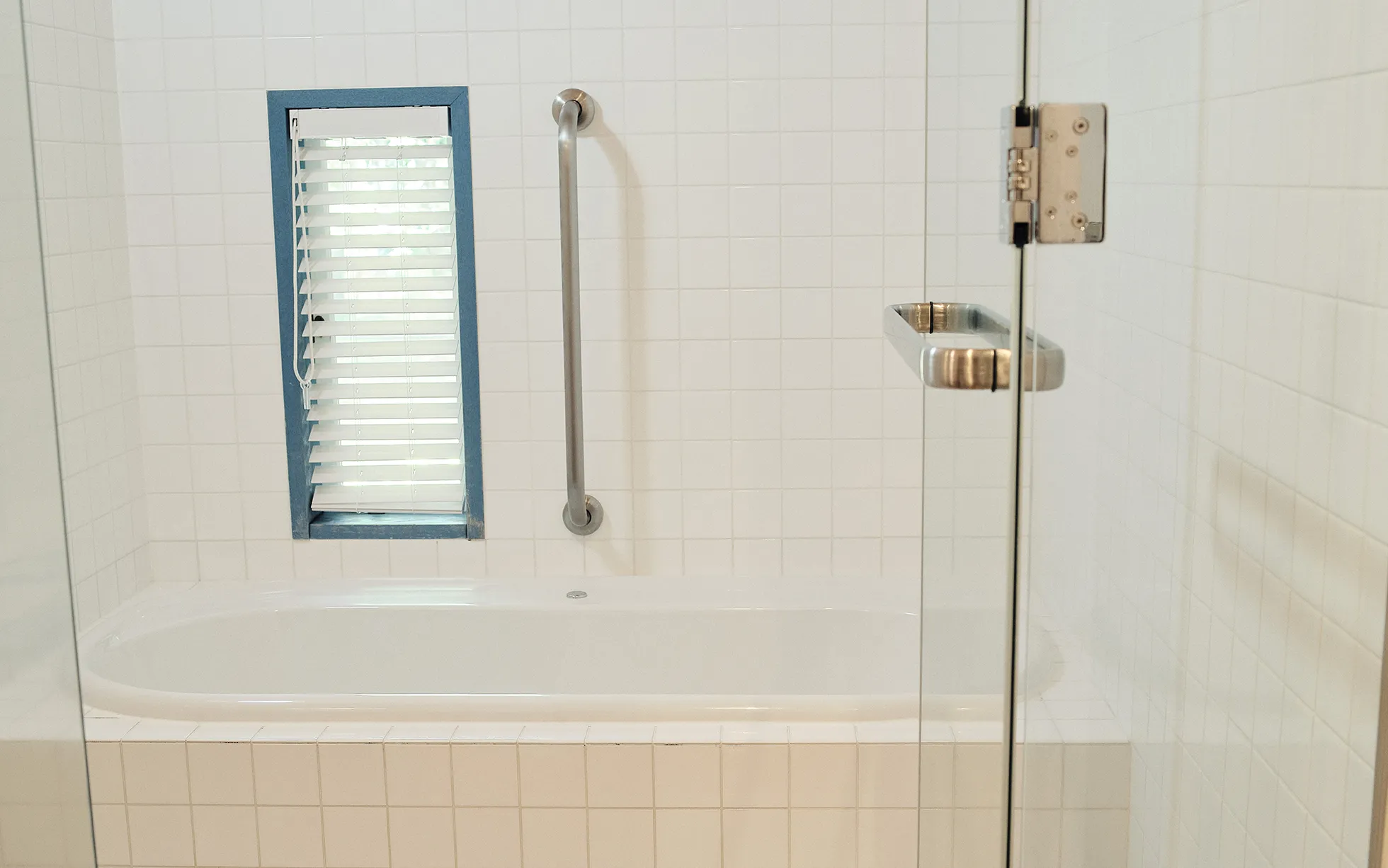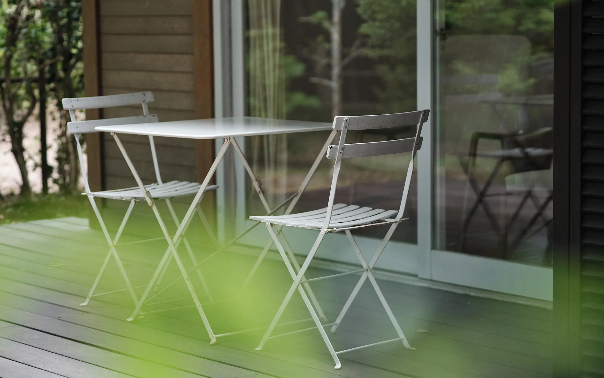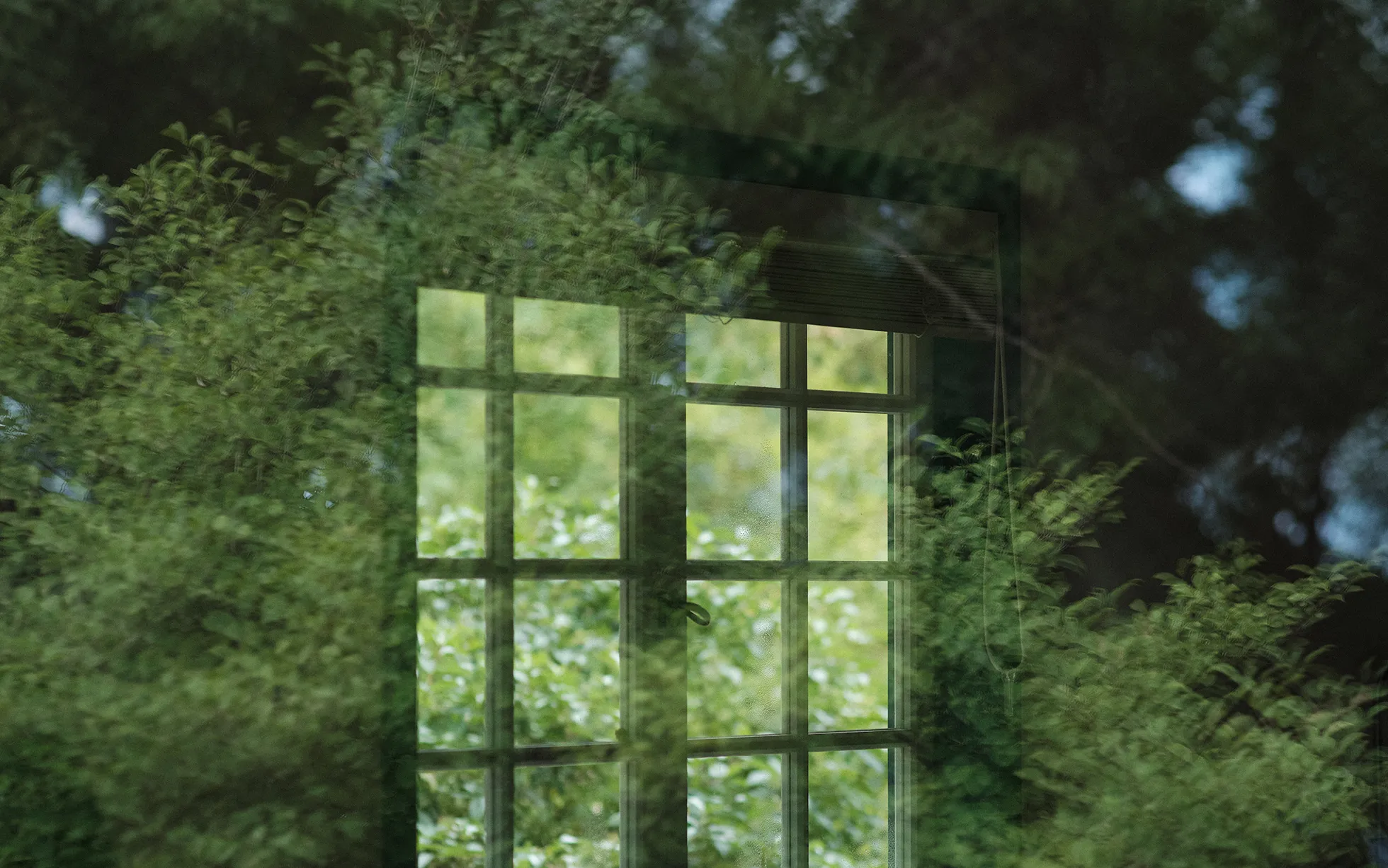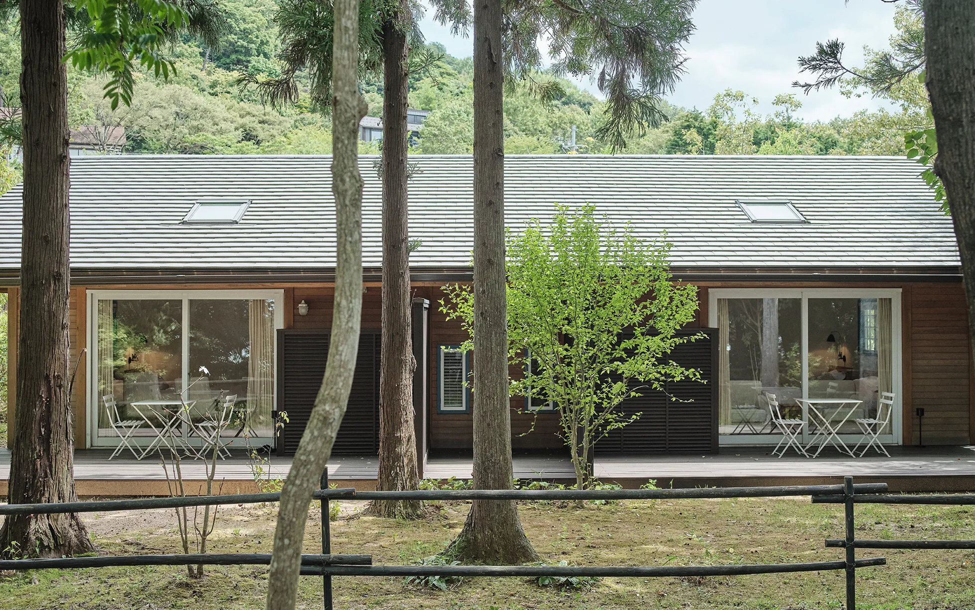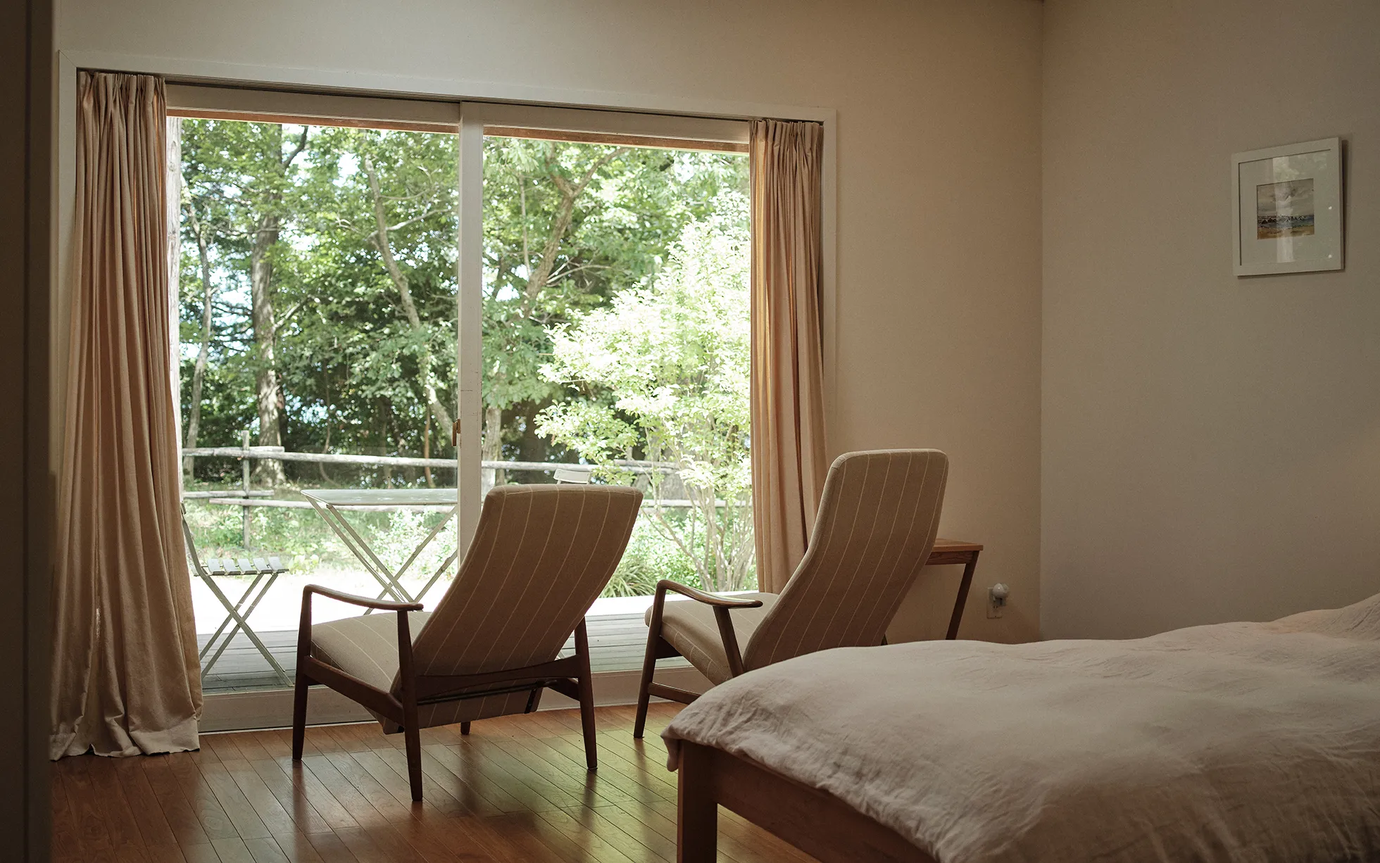 デッキに続く大きな窓からは、林越しに久美浜湾の水面が楽しめます。